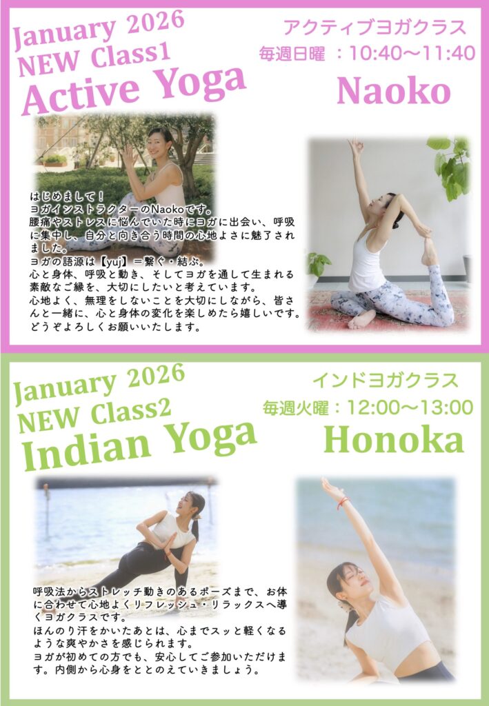 2026年からは、新しいインストラクターを迎え、より充実したヨガクラスをお届けしてまいります。