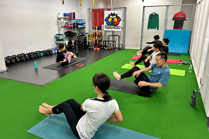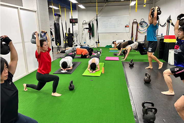 毎回違ったメニューで⾏い、常に⾝体に違った刺激を与え、新しいメニューを仲間たちと挑戦する楽しみもあります。⼀⼈で黙々と同じ動作を繰り返すのと違い、飽きずに楽しく続けられます。