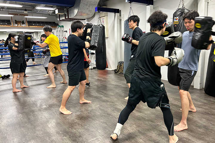 技術向上が⽬的の⽅や実戦向けの攻防練習などに興味がある⽅を対象に、クラス⽣同⼠でのミット打ちやライトマススパーなどを⾏っています。