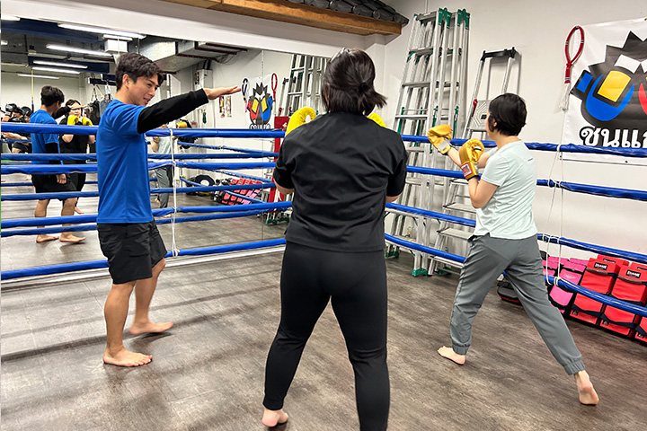 ウォーミングアップから、構えやジャブ・ストレートの打ち⽅、コンビネーションなど、細かく指導しています。